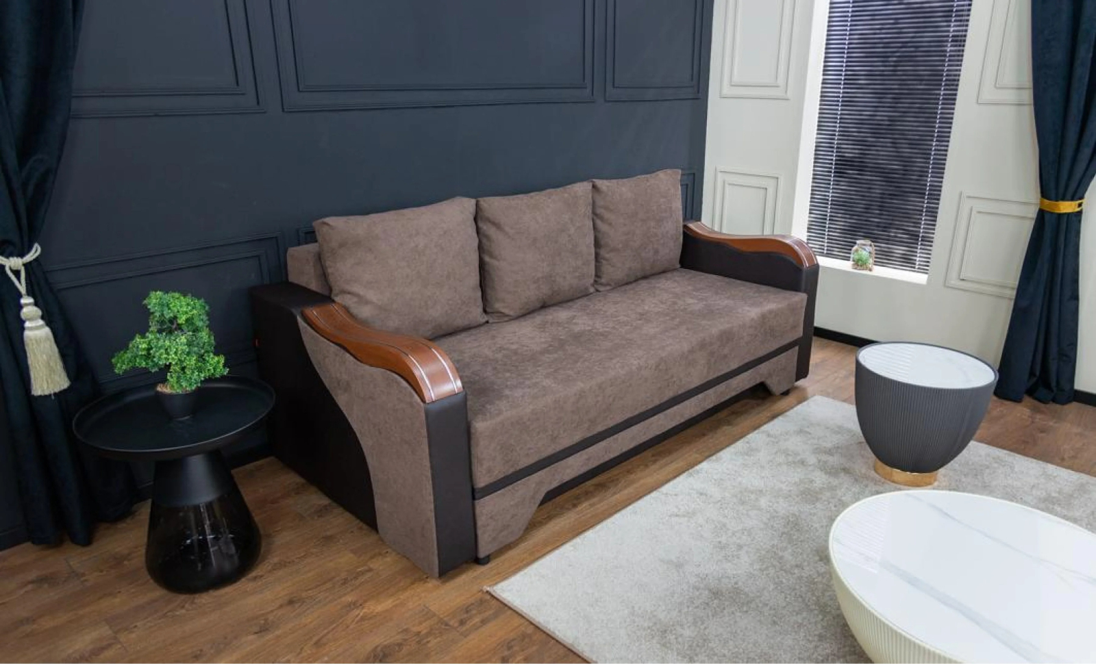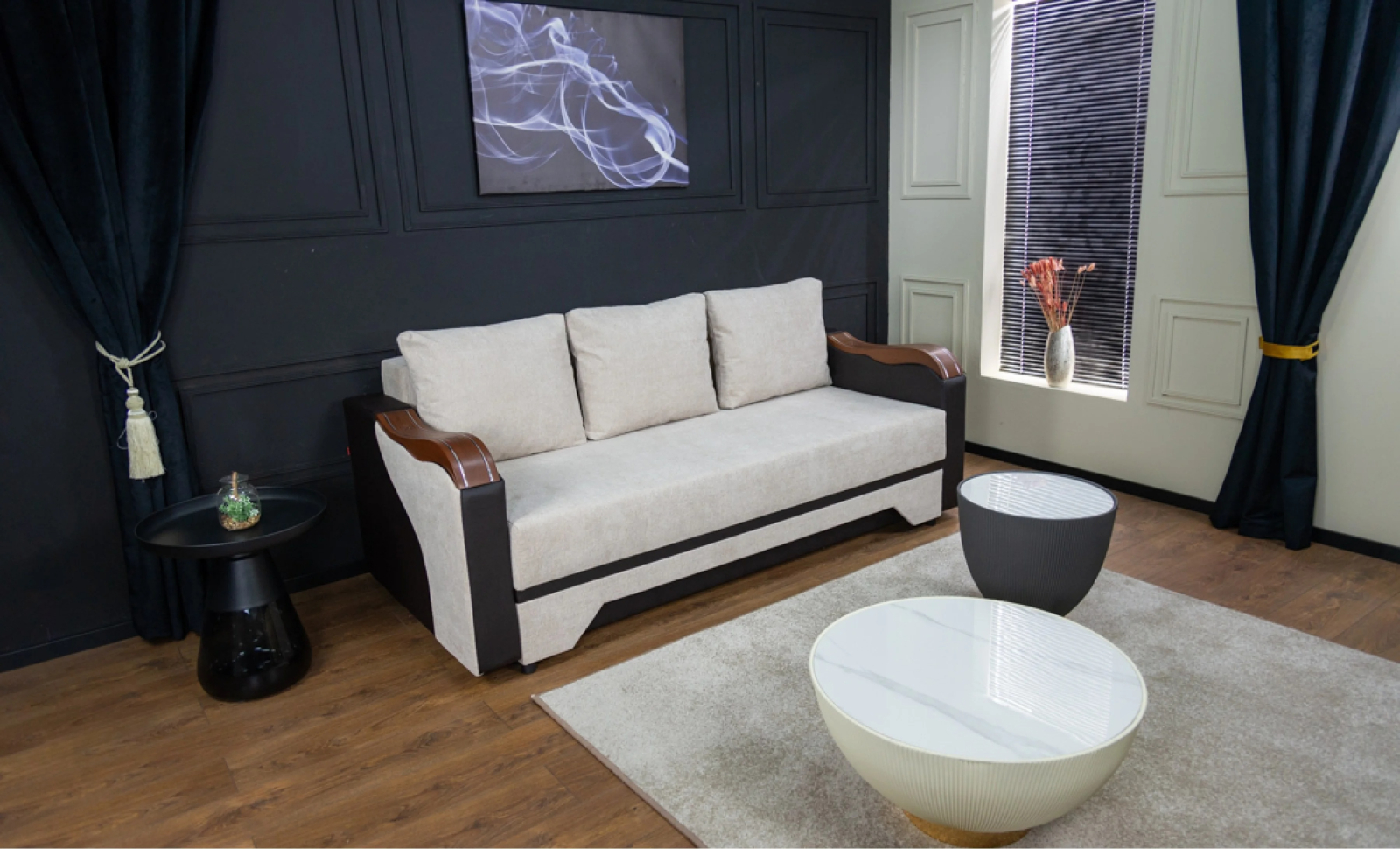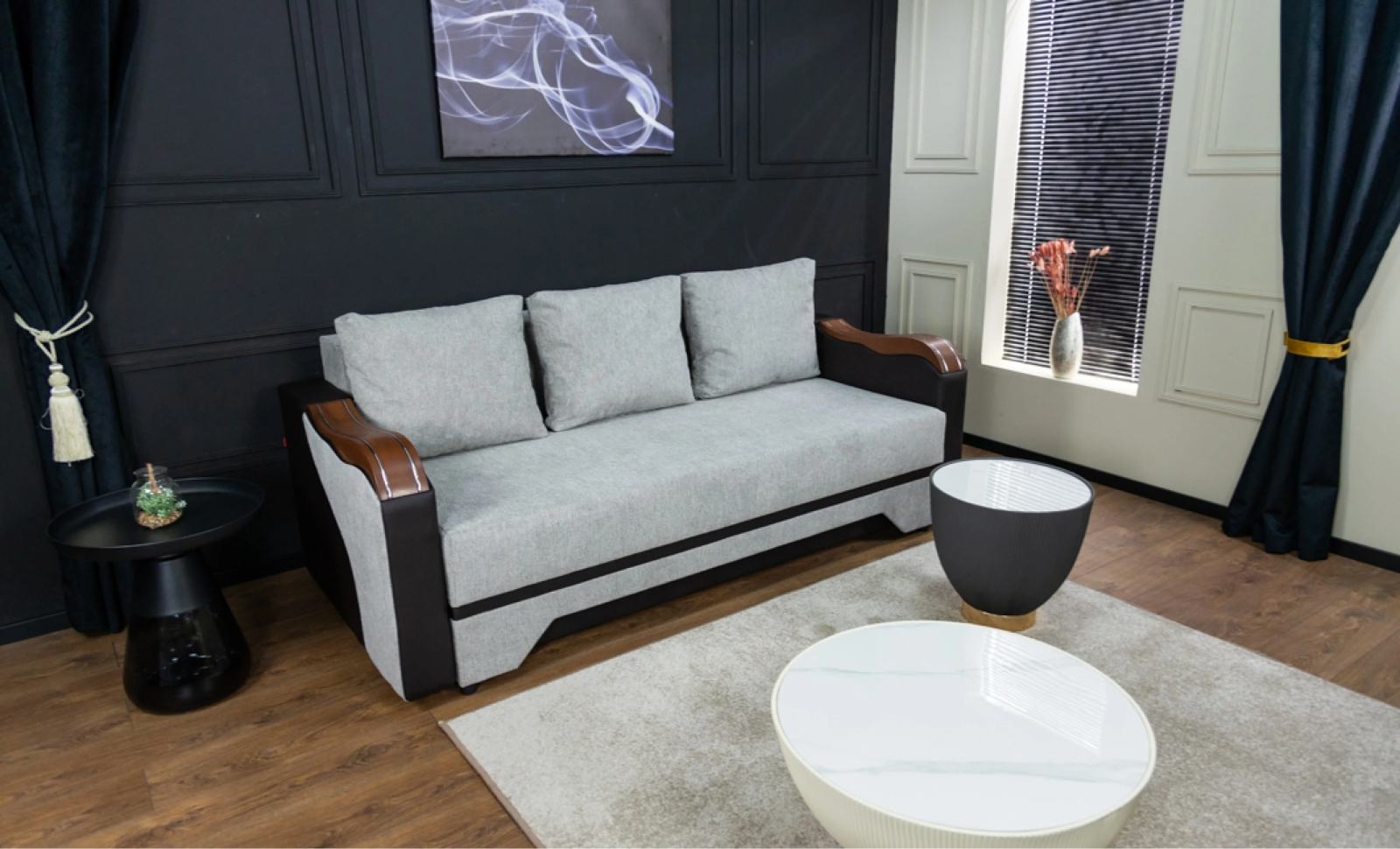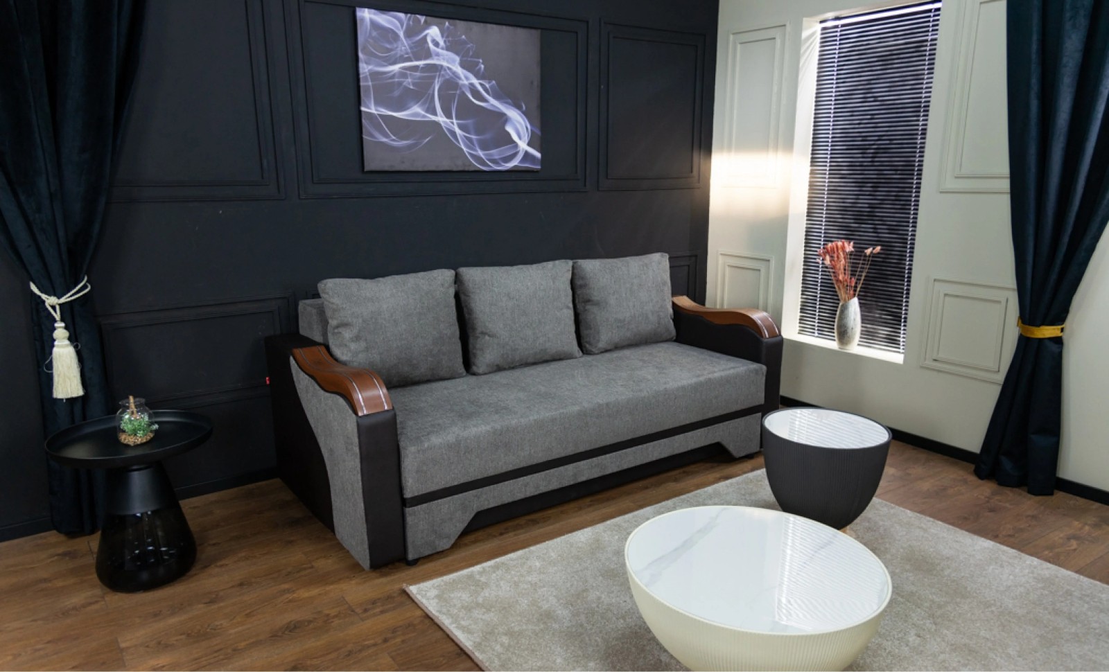 Îmbină stilul cu utilitatea prin faptul că este prevăzută cu ladă pentru depozitarea lenjeriei, a pernelor sau a păturii și pentru a păstra la îndemână toate articolele frecvent utilizate. Canapeaua oferă un confort sporit prin cele 3 perne detașabile și se transformă rapid și ușor într-un pat spațios de 190 x 165 cm, atunci când scoți pernele și tragi șezutul în exterior, coborând spătarul.