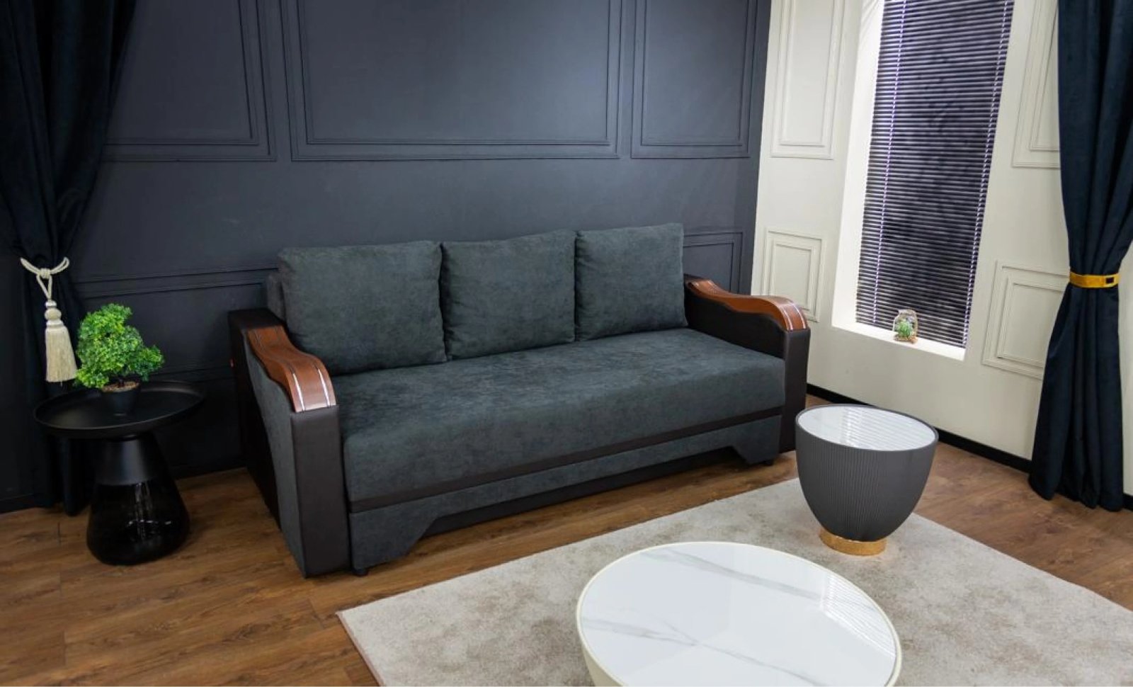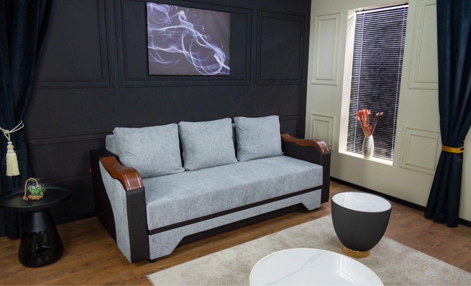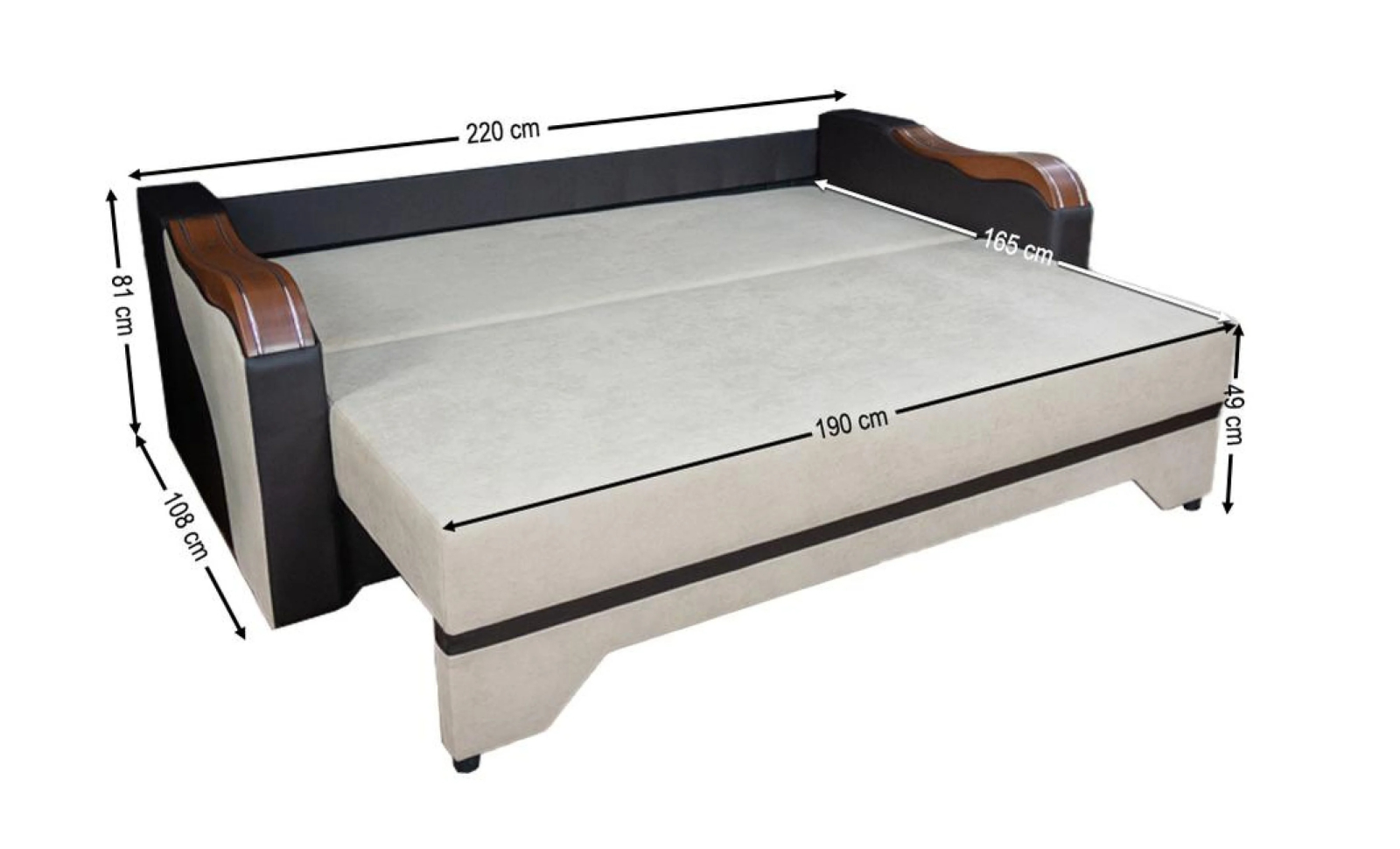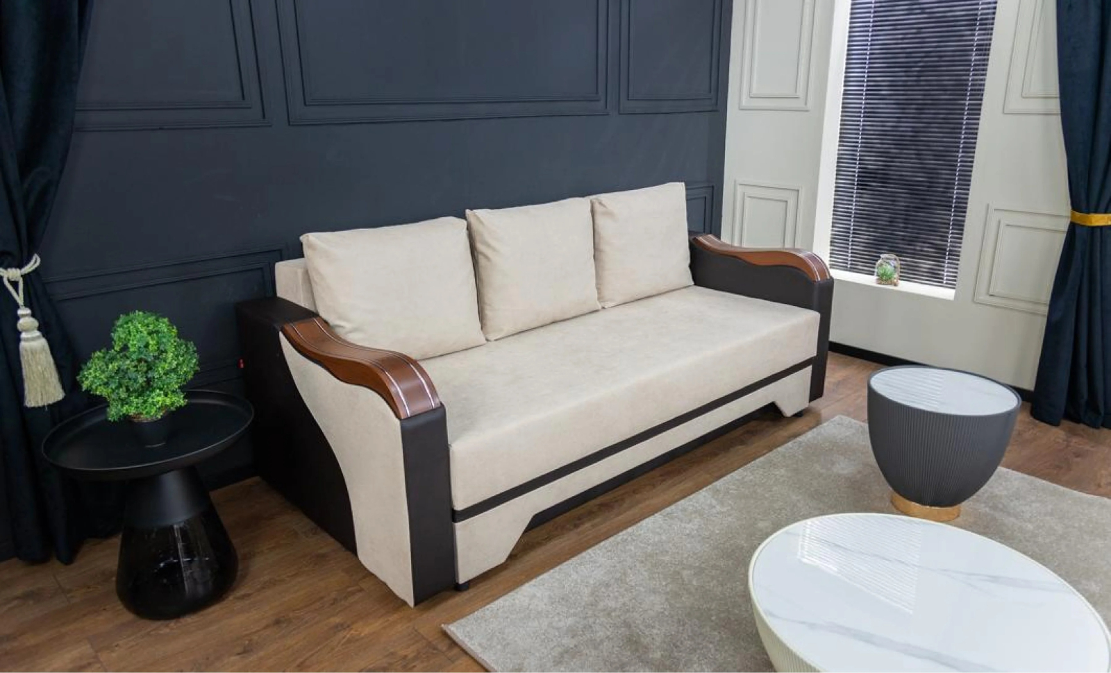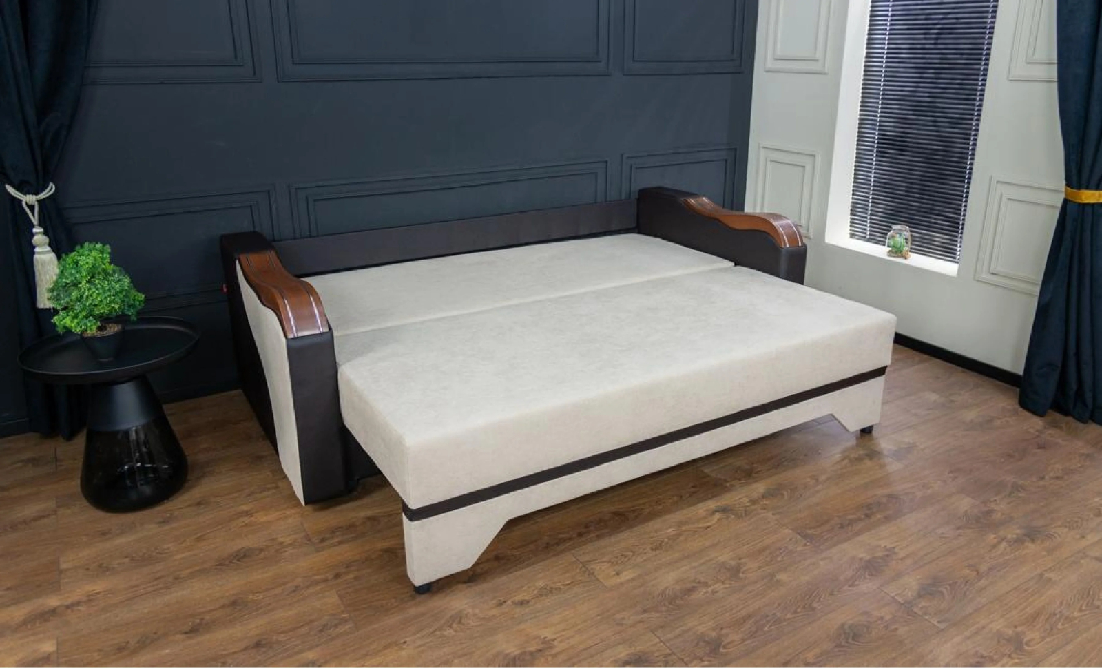 Îmbină stilul cu utilitatea prin faptul că este prevăzută cu ladă pentru depozitarea lenjeriei, a pernelor sau a păturii și pentru a păstra la îndemână toate articolele frecvent utilizate. Canapeaua oferă un confort sporit prin cele 3 perne detașabile și se transformă rapid și ușor într-un pat spațios de 190 x 165 cm, atunci când scoți pernele și tragi șezutul în exterior, coborând spătarul.