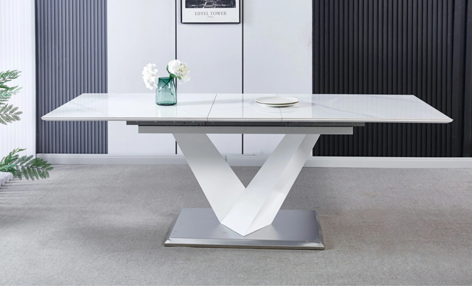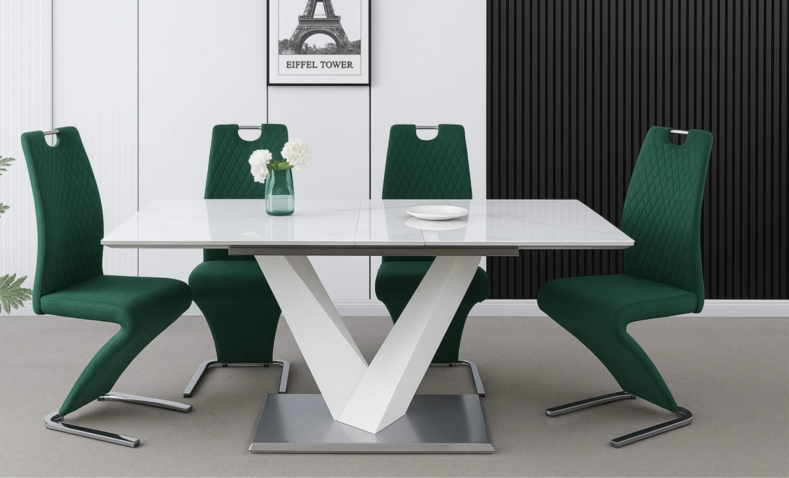 Setul masa extensibilă RJT418 și 4 scaune R692 verzi, este perfect pentru un living modern, aducând un echilibru între stil, funcționalitate și confort. Masa RJT418 se remarcă prin blatul din ceramică durabil și elegant, ideal pentru utilizarea zilnică. Baza din oțel negru mat oferă o stabilitate excelentă și un aspect sofisticat. Extensiile ascunse sub blat permit păstrarea unui aspect compact atunci când masa nu este extinsă, dar oferă spațiu suplimentar pentru momentele în care primiți oaspeți.
