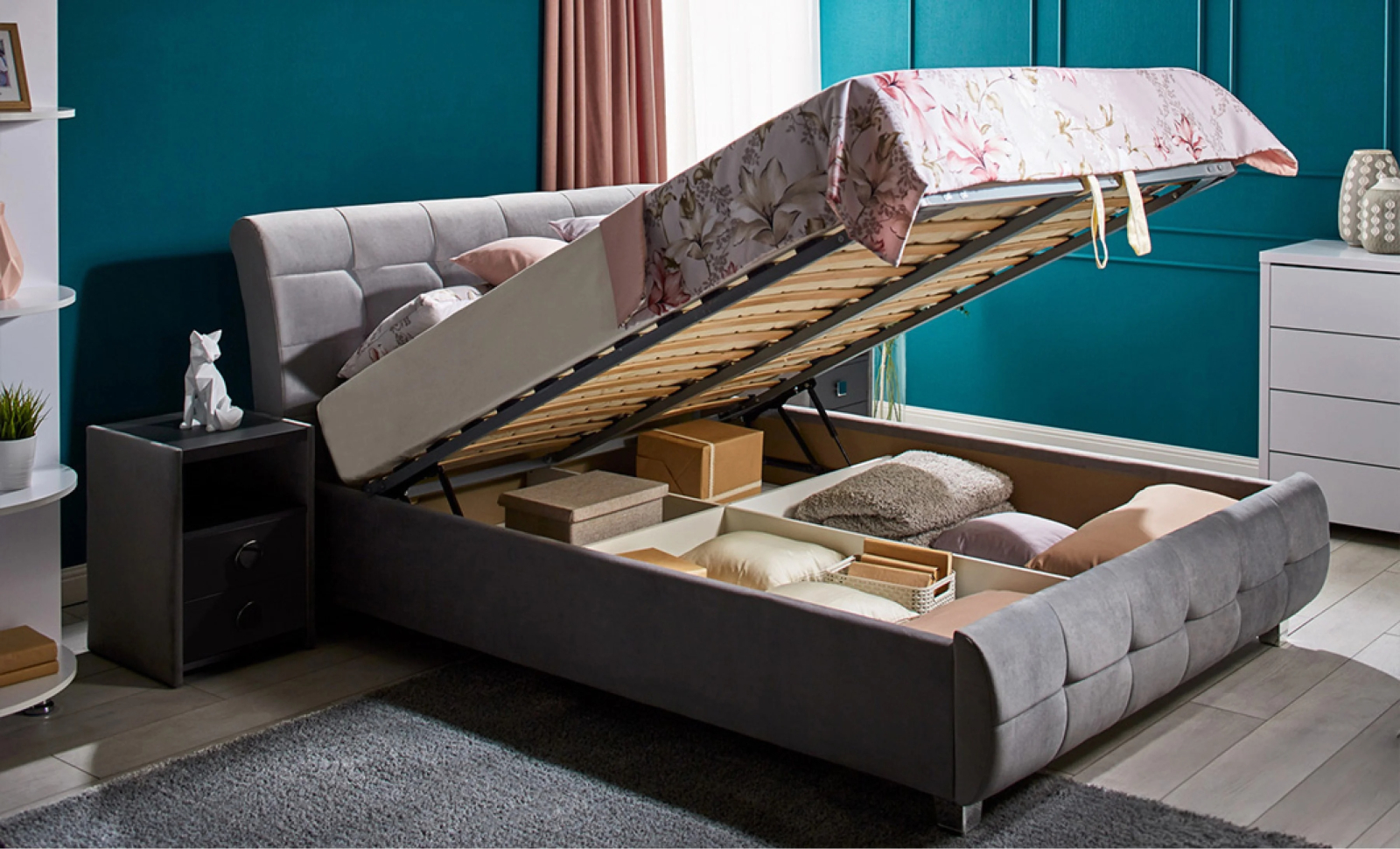 Pat tapitat, cu somiera, lada depozitare incluse SAMBA (personalizabil)
