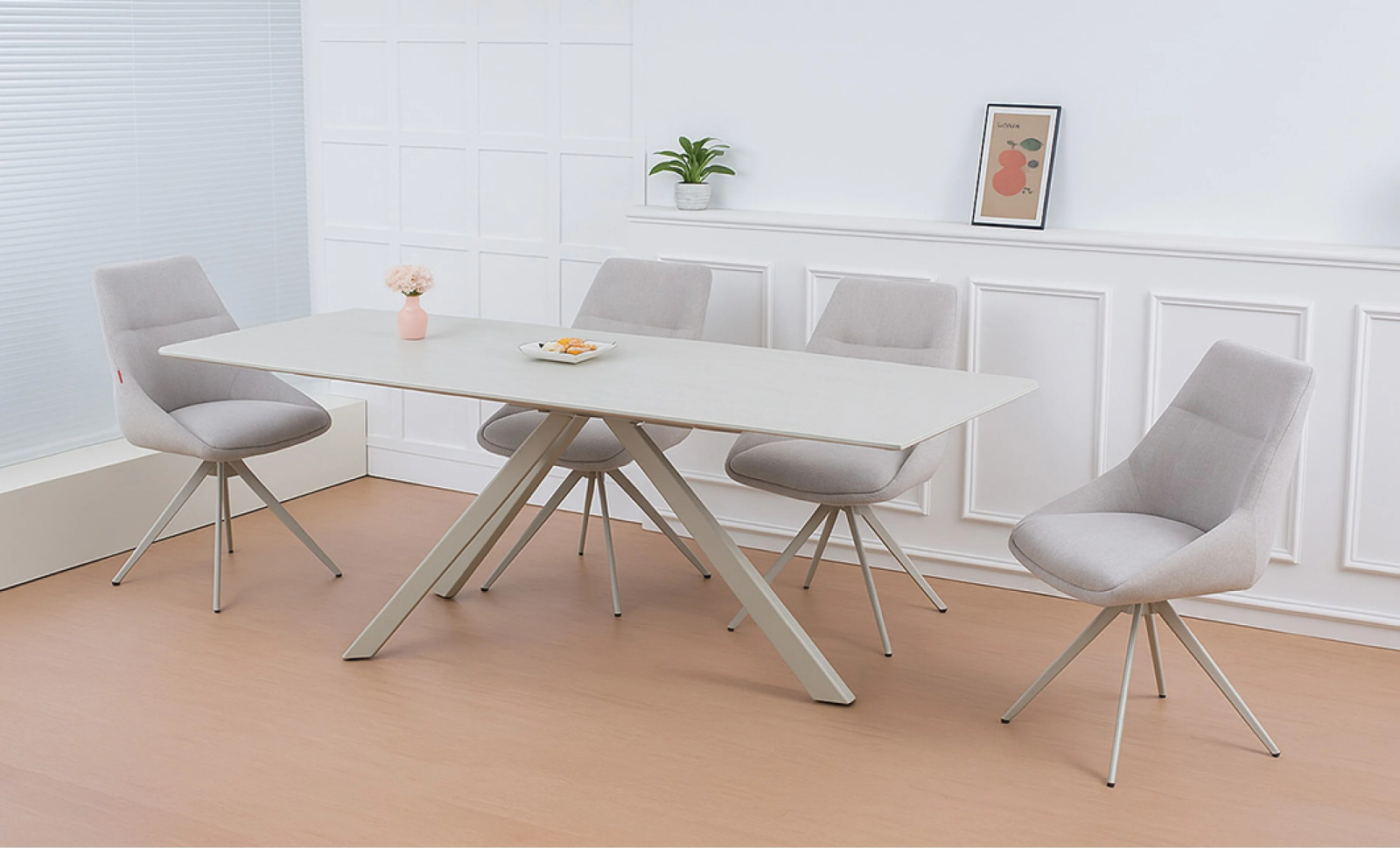 Scaunele R0108CS completează perfect masa, având un design modern și o tapițerie din stofă gri deschis, plăcută la atingere. Funcția rotativă oferă libertate de mișcare și confort sporit, iar baza metalică asigură stabilitate și durabilitate. Împreună, masa și scaunele creează un ambient rafinat, confortabil și primitor.