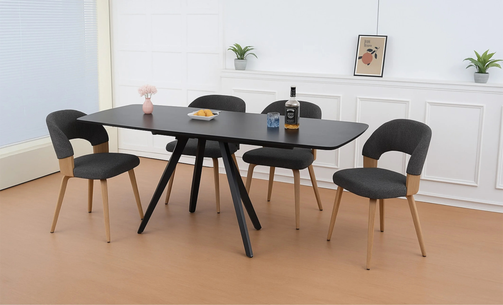 Transformă-ți zona de dining într-un spațiu elegant și primitor cu Setul Masă Living Extensibilă R0109 și 4 Scaune Tapițate R6450. Realizat în nuanțe rafinate de gri, acest set combină stilul modern cu funcționalitatea practică.