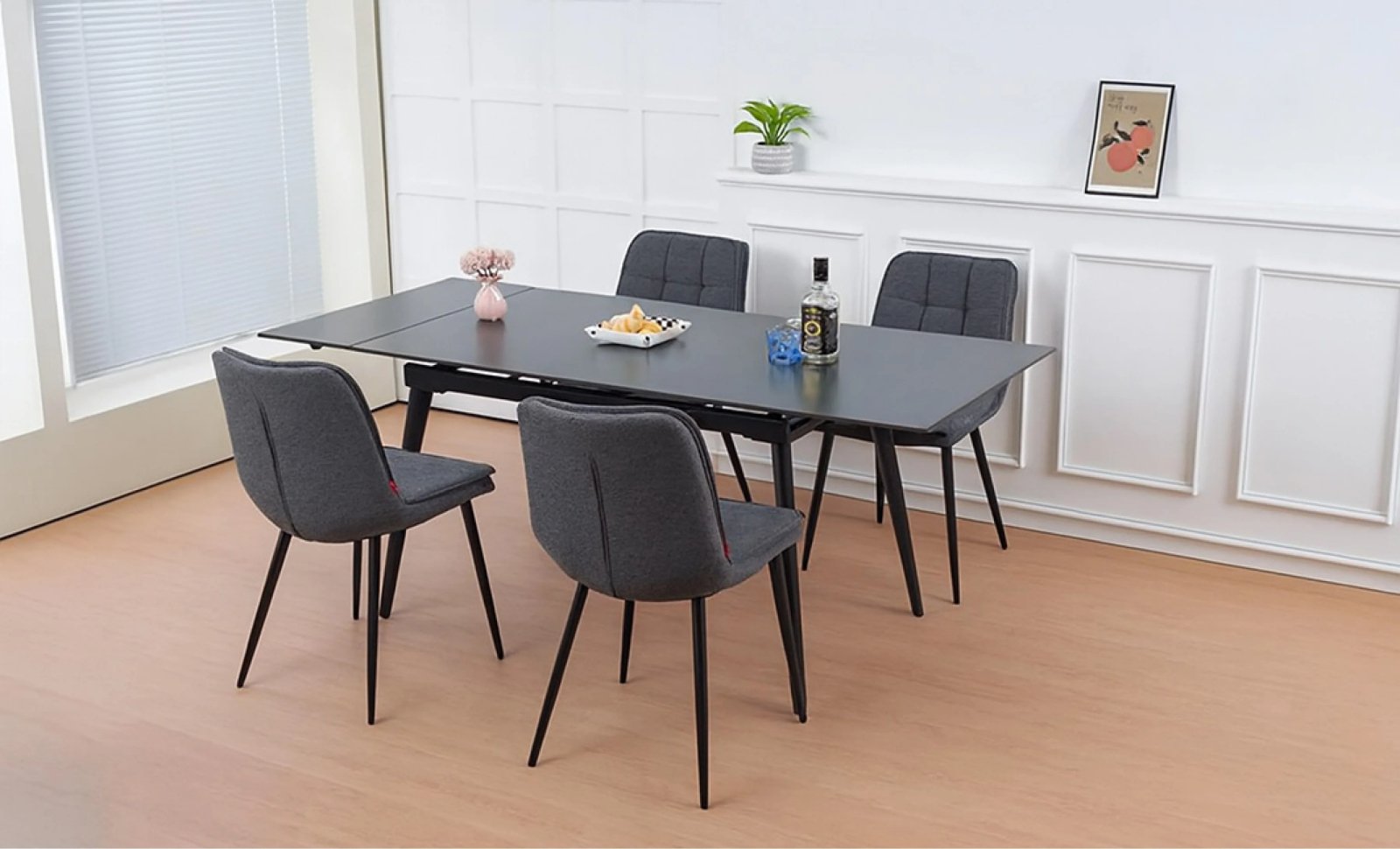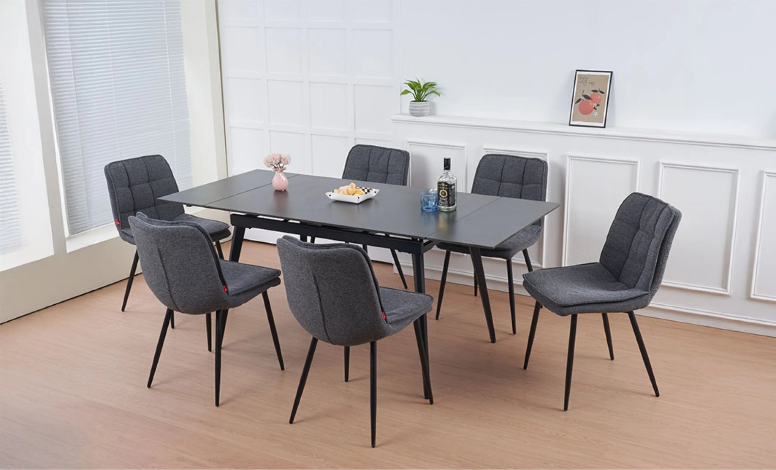 Scaunele R2001 completează armonios ansamblul, datorită tapițeriei fine din stofă bej și a designului ergonomic. Oferă confort sporit și stabilitate, fiind potrivite pentru utilizare zilnică. Culoarea bej creează o atmosferă caldă și primitoare, potrivită pentru decoruri moderne sau clasice.