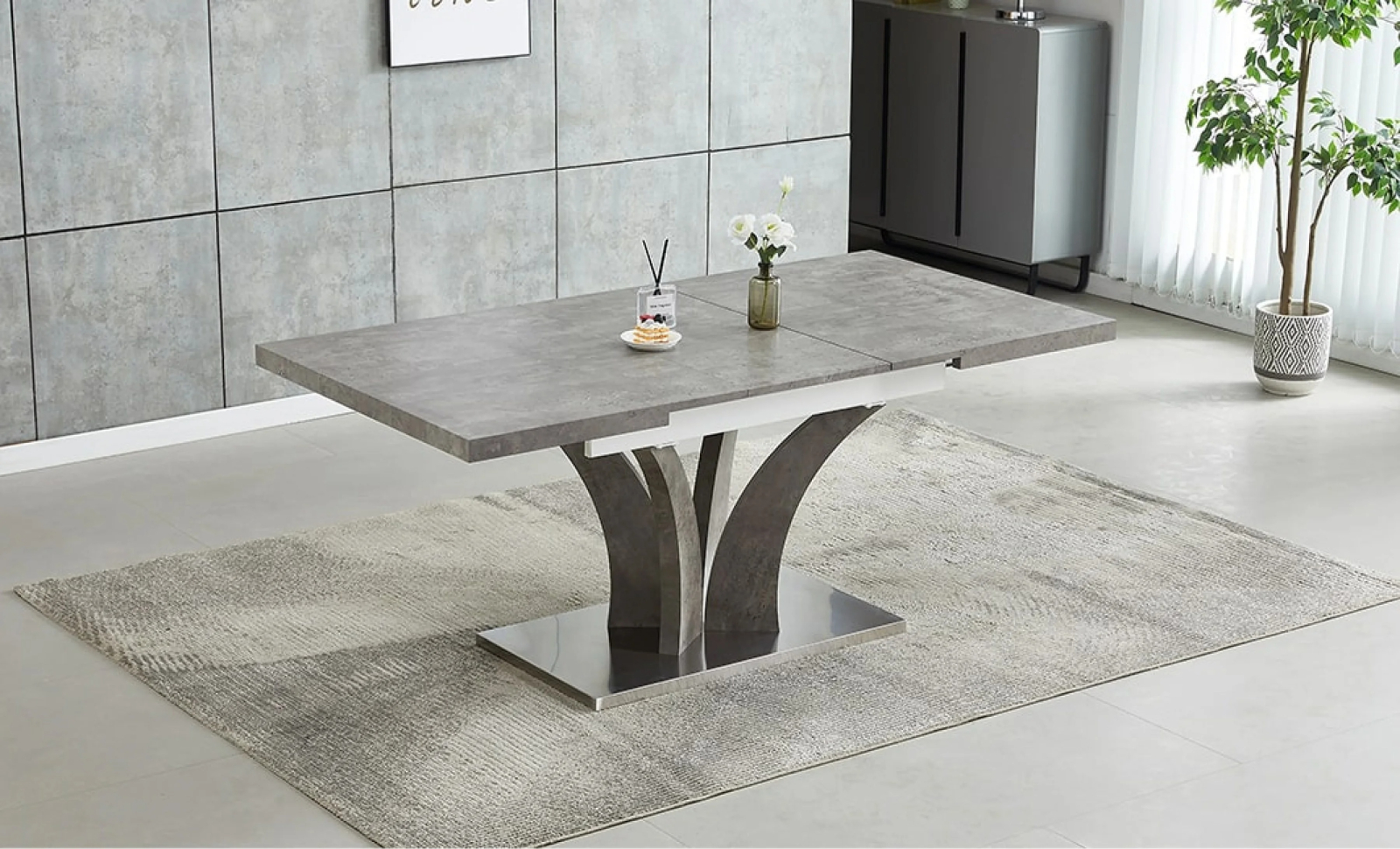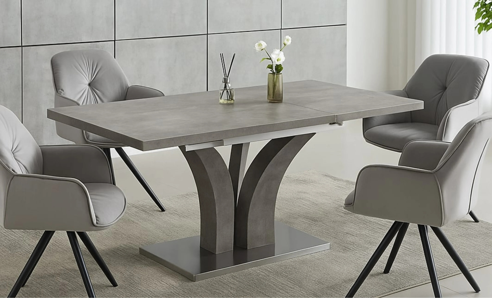 Adăugați un plus de rafinament și funcționalitate spațiului dvs. de dinning cu Setul de Masă Extensibilă R385 și cele 4 Scaune R80.. Masa, cu o finisare sofisticată în nuanța de gri și un blat extensibil din MDF gri lucios, este o piesă centrală elegantă în orice încăpere.