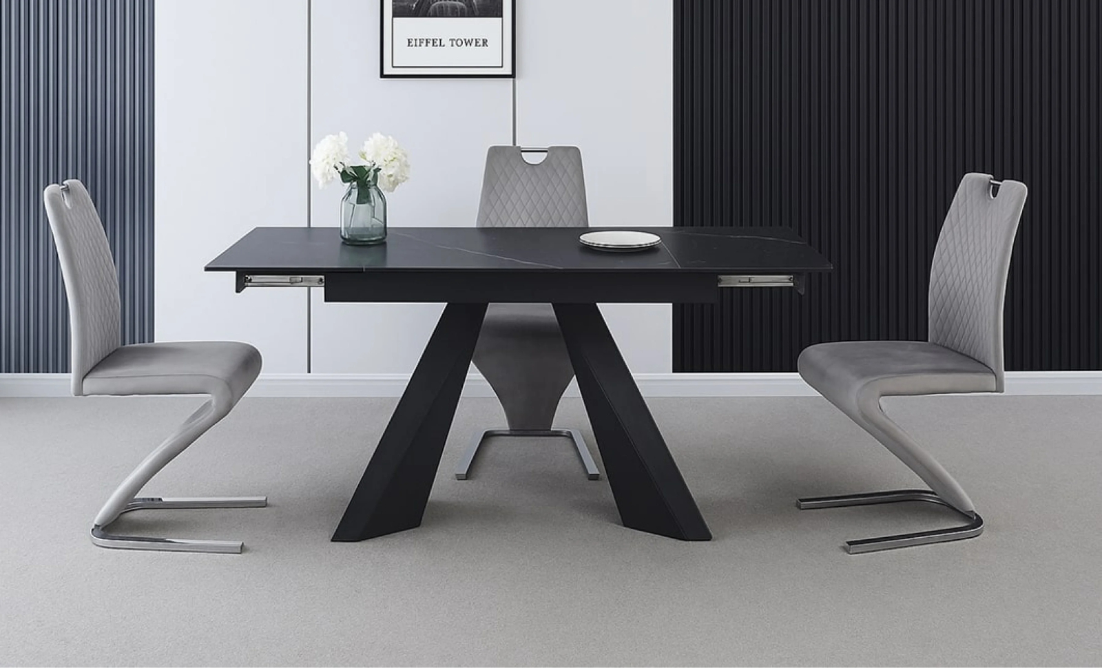 Setul masa extensibilă R416 și 4 scaune R692/3 gri, este perfect pentru un living modern, aducând un echilibru între stil, funcționalitate și confort. Masa R416 se remarcă prin blatul din ceramică durabil și elegant, ideal pentru utilizarea zilnică. Baza din oțel negru mat oferă o stabilitate excelentă și un aspect sofisticat. Extensiile ascunse sub blat permit păstrarea unui aspect compact atunci când masa nu este extinsă, dar oferă spațiu suplimentar pentru momentele în care primiți oaspeți.